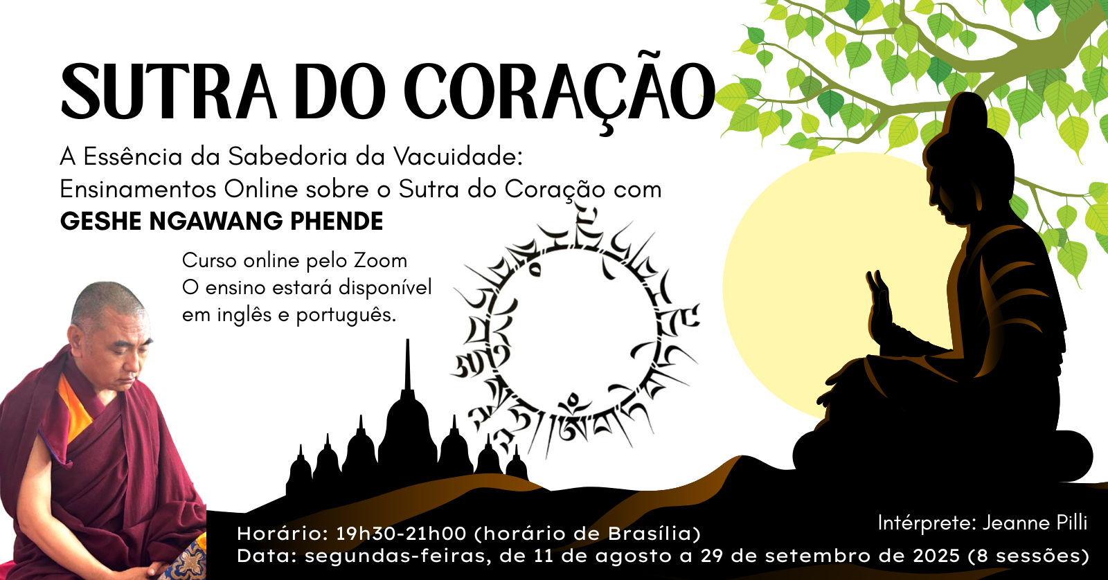 Jeanne Pilli será a intérprete, garantindo uma transmissão fluida dos profundos insights compartilhados por Geshe Ngawang Phende. Quer você seja um praticante experiente ou novo no caminho, esses ensinamentos visam enriquecer sua compreensão do budismo e fornecer ferramentas práticas para uma vida mais significativa e plena.